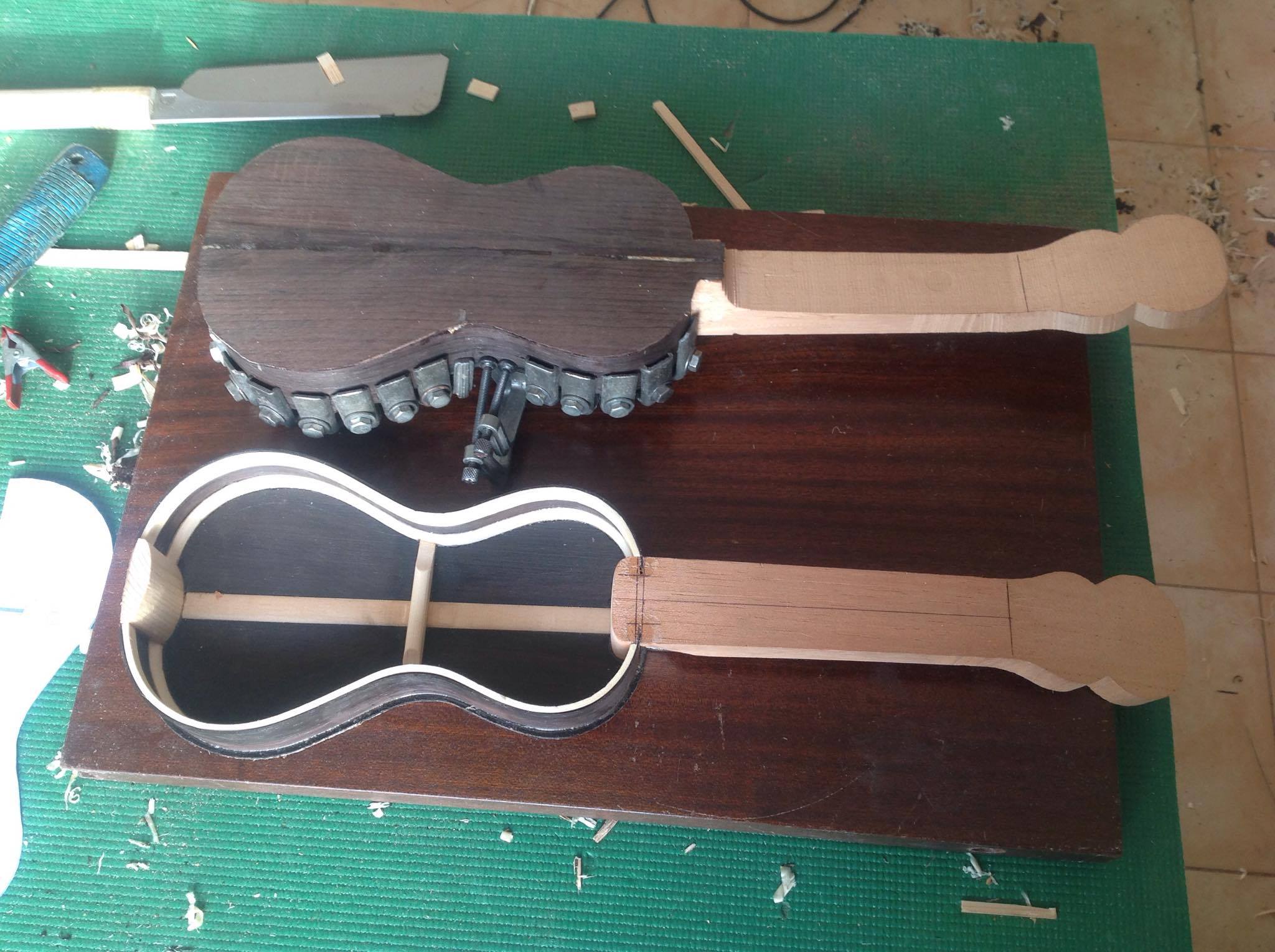 Fotos da construção de cavaquinho urbano por Fernando Meireles, réplica do modelo original construído em Coimbra por António dos Santos